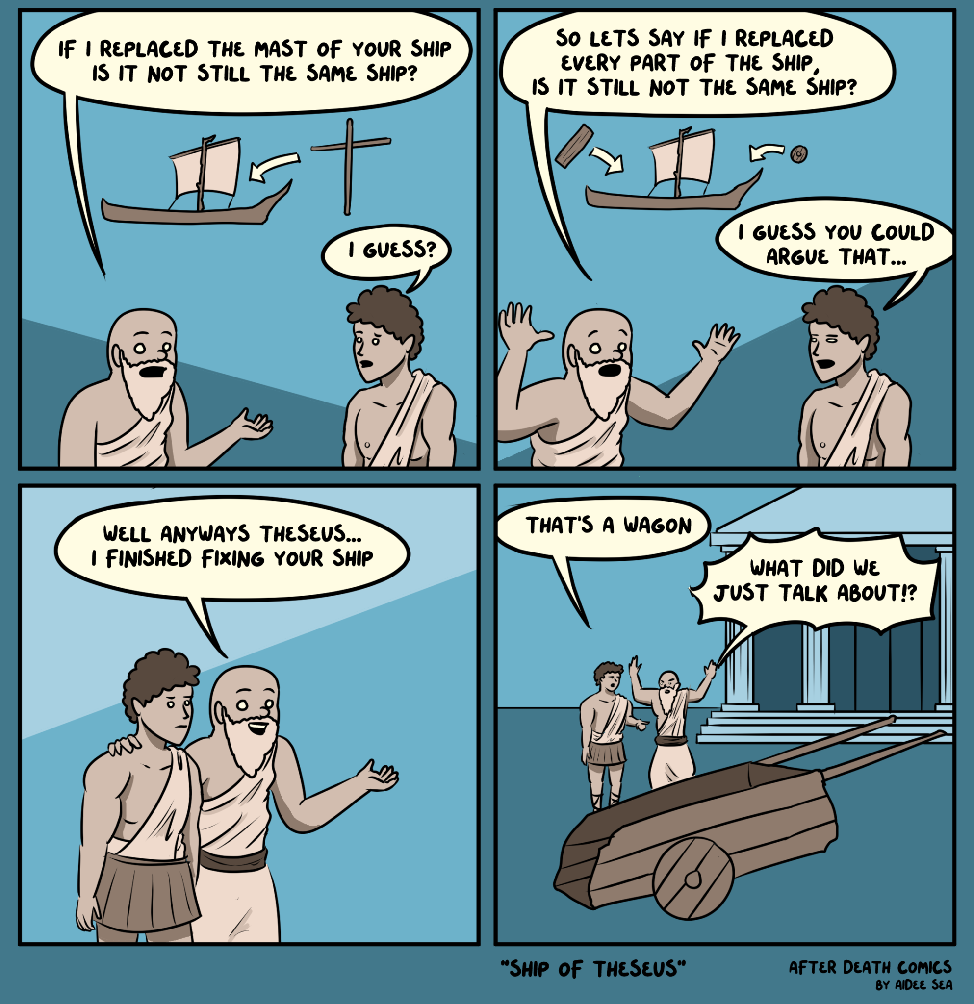 Yeah, but you didn’t shed them all at once. If the ship of Theseus exploded, and then they built a new one, the question wouldn’t be, “Which is the true ship of Theseus?” it would be, “Hey, did you guys see Theseus’ new ship?”