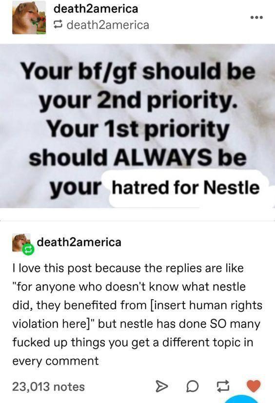 Literally impossible to avoid Nestle. Even going to a restaurant or getting take out, benefitted Nestle in some way. Really it’s the fault of governments for allowing a corporation to get that big