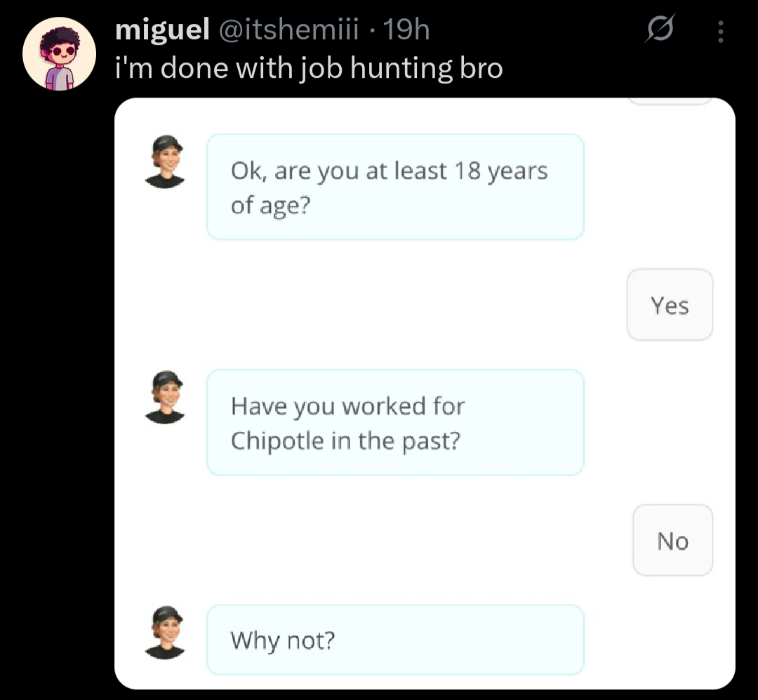 “Because it’s a soul-crushing, dead-end minimum wage job” Then why are you applying now? “Because I’ve always dreamed of working at Chipotle. I love this franchise, the food, the people, and want nothing more than to work for you”