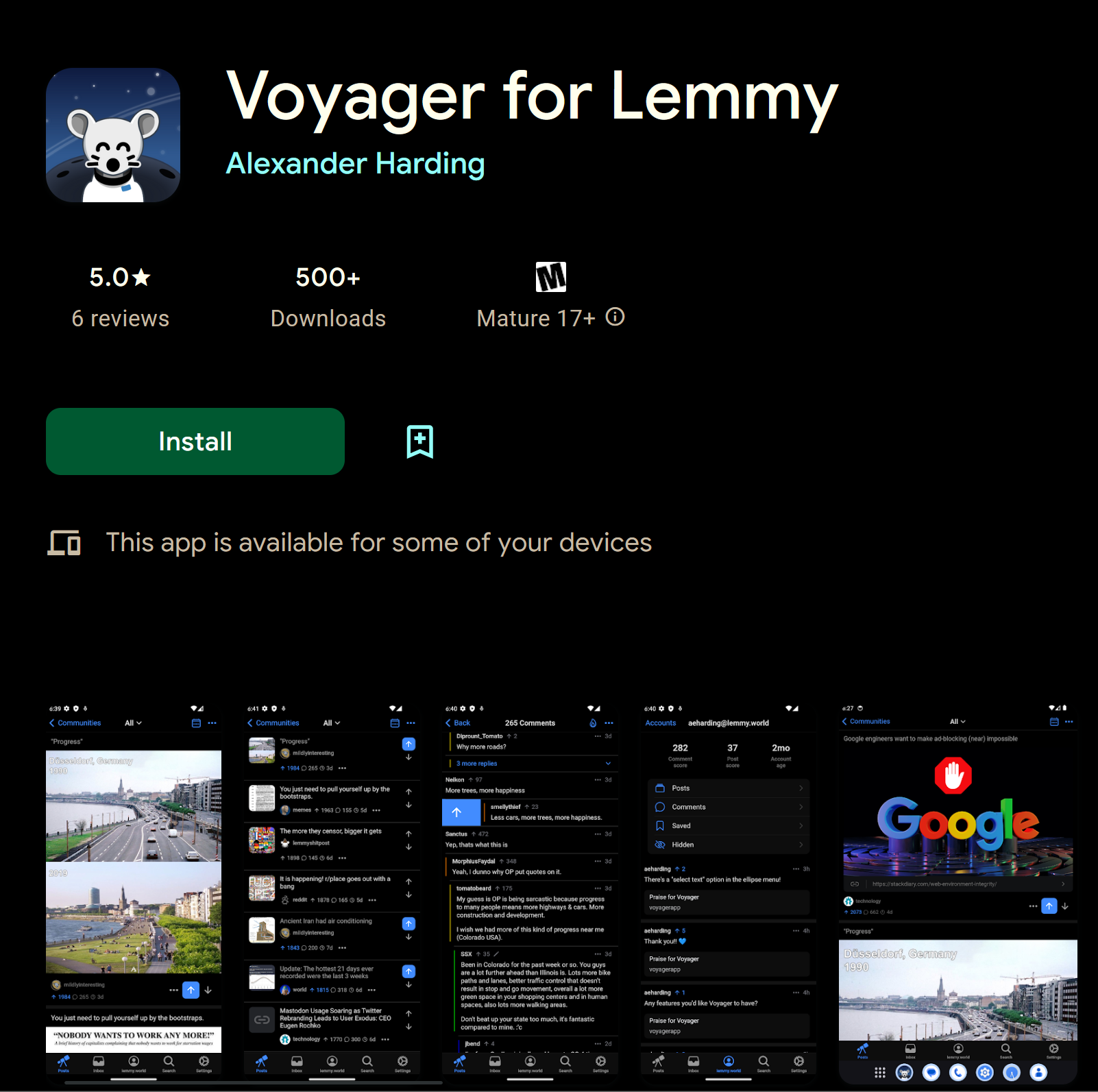 If you search for “voyager lemmy” reddit is like the 3rd hit, and “voyager for lemmy” is like #30 after a bunch of completely random apps.