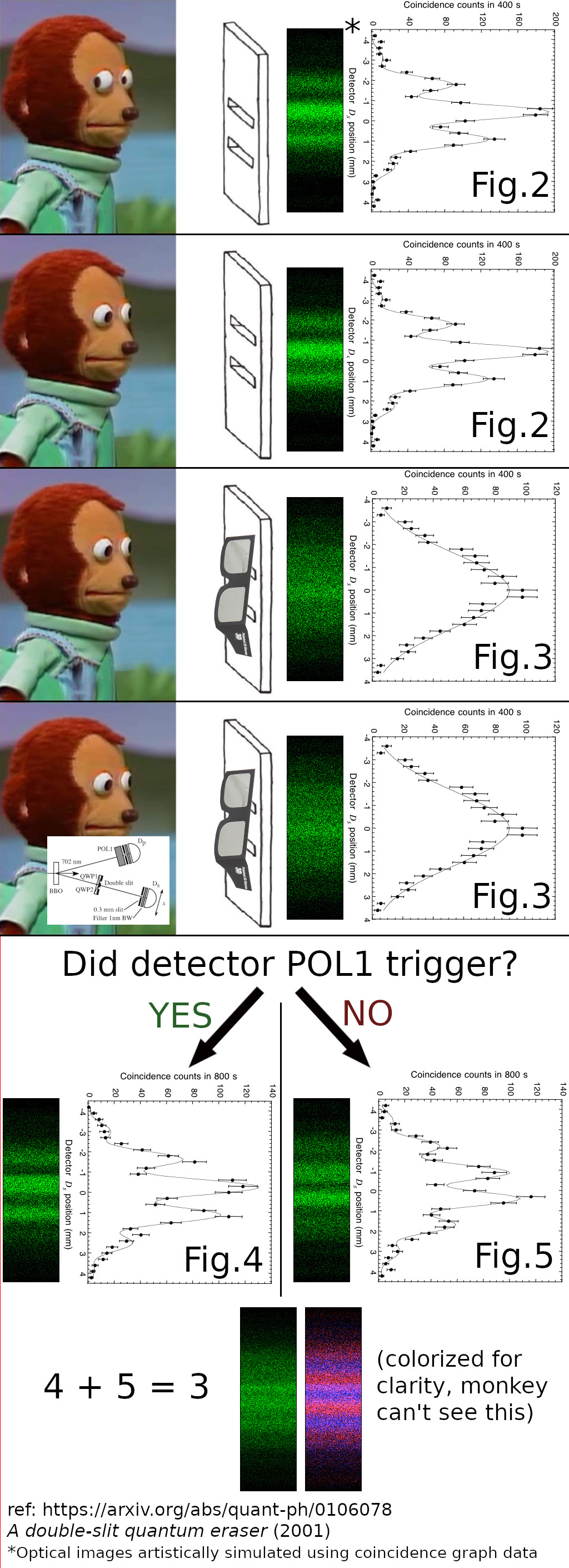 The recent post made me fear that a lot of you are taking this “monkey looks at double-slits” meme, which was only ever supposed to be a funny monkey meme, actually seriously. Honorable mention goes to @kromem@lemmy.world, whose 12 posts on the topic, insisting that the quantum eraser experiment (but not the delayed-choice quantum eraser!) proves that the double slit is somehow bizarre, forced me to make my own meme. This meme explains the (non-delayed choice) quantum eraser paper from arXiv:quant-ph/0106078 and the figures are numbered to reference the paper.