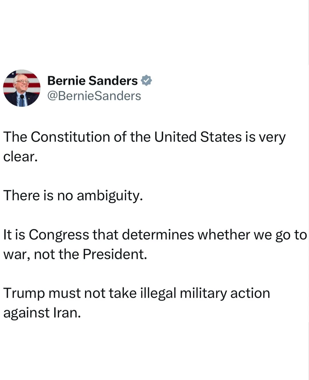 Don’t get me wrong I love Bernie but again this is political posturing. Propose articles of impeachment or stfu. Btw we’re already “at war” with Iran. Ted Cruz confirmed that they approved the missile strikes and have been providing guidance and support to maintain Israel’s advantage.