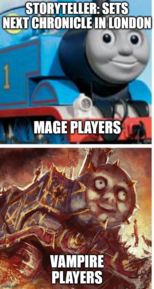 Mages have been in a brutal war since XIII Century, between those who use magic and Technocracy, who wants to replace magic with science (which is just magic operating on different rules). Technocracy is winning and has run Pogroms (actual I-kid-you-not in-universe name) of “Reality Deviants” - Mages, Fae, Werewolves, Wraiths etc. Except in London, where both sides are relatively chill and local Technocracy believes polite debate is far more effective than gunning down Mages in the street, like barbarians. Most drastic events of the Mage metaplot had minimal effect on Mage society in London.