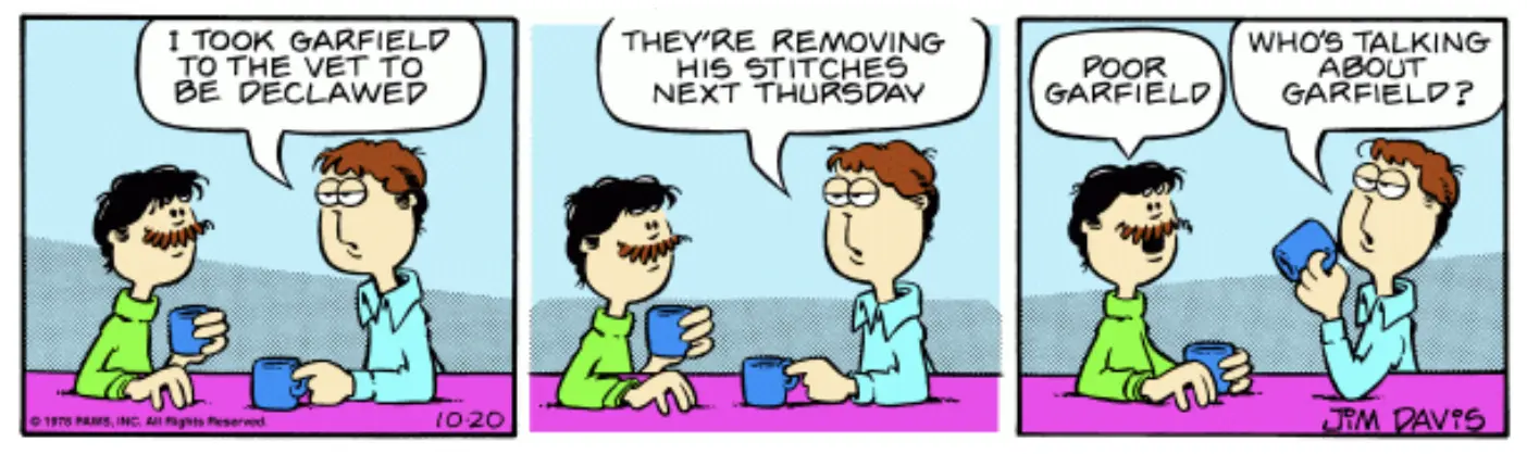 The joke is ruined when he says “his stitches.” It makes it very clear that he’s talking about Garfield, so the punchline makes no sense. The phrase Jim Davis should have gone with is “the stitches.”