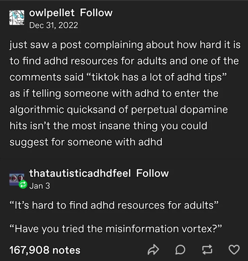 For actual tips though, healthygamersgg on YouTube/Twitch is an excellent resource. He is a licensed therapist and has a ton of adhd videos and other topics.