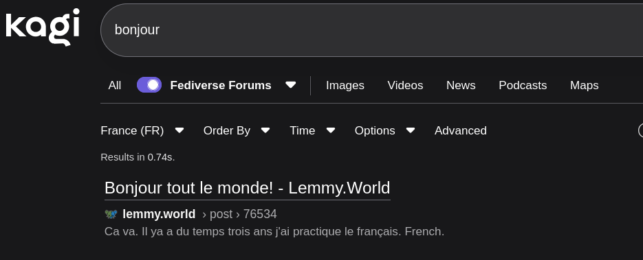 arrow-up1503arrow-down1external-linkKagi (paid search engine): "Peertube results now show up in regular searches, plus you can filter by "source" to see more Peertube content."kagi.commesa@piefed.social to Fediverse@lemmy.worldEnglish · 5 months agomessage-square79linkfedilinkfile-textcross-posted to: peertube@lemmy.world