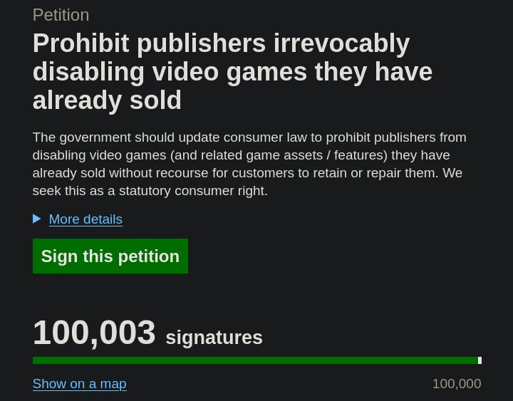 Keep pushing. There are probably people using VPNs to sign the petition and those will get purged. Either from idiots who don’t know better or AAA studios trying to get people to stop now that it’s reached the goal. This is true for both the UK and EU petitions.