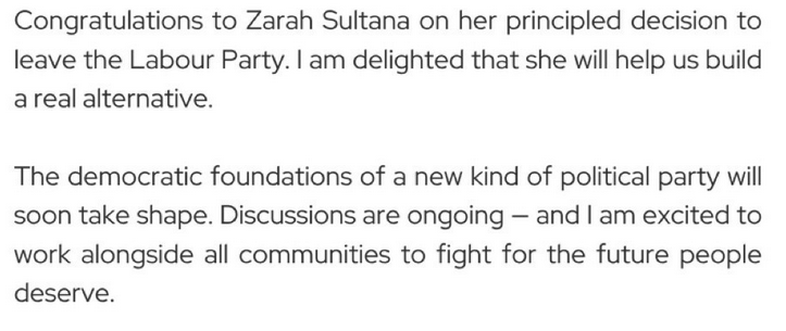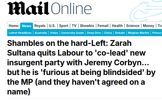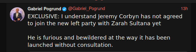 Just for anyone still following this odd developing story, Corbyn has now issued a statement in which he says ‘discussions are still ongoing’ about a ‘real alternative’, but does not say he’s going to be co-leader of anything. This seems to me to match what Jessica Elgot and Gabriel Pogrund were reporting yesterday: that, contra Zarah Sultana’s statement, there’s not (yet) a new party and Corbyn is not co-leader.