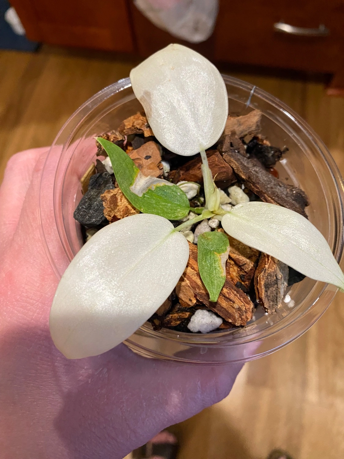 So when I got her, I transferred to a semi hydro setup in perlite (she had sad, spindly little roots, and I was thinking it would be gentler than pon as the semi hydro roots developed). Then I put the thin, fragile thing under a grow light and scorch the few tiny green leaves that are actually photosynthesizing.