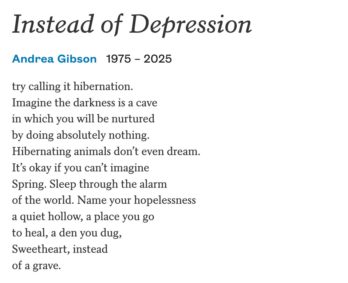 arrow-up175arrow-down1imageAndrea Gibson, "Instead of Depression".BonesOfTheMoon@lemmy.world to Poetry@lemmy.world · 3 months agomessage-square4linkfedilinkfile-text