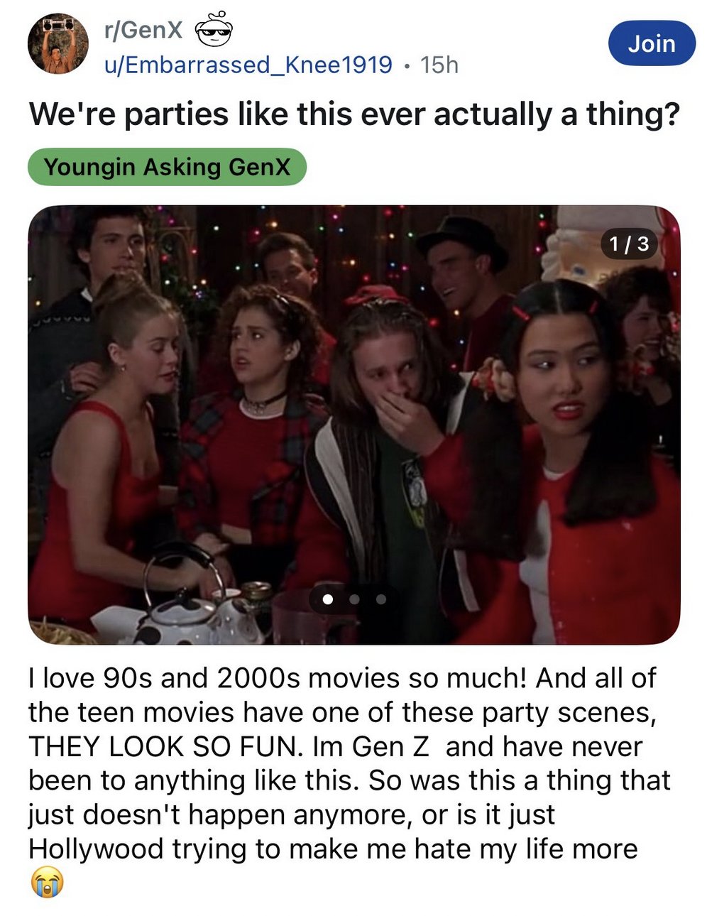 minus-squareTidesphere@lemmy.worldlinkfedilinkarrow-up12·3 months agoI mean, I’m a millennial in mid-thirties and I’d never heard of anyone actually doing a party like this either, so even in the 90s/00s these were things that seemed like ‘stuff they used to do before’