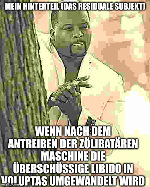 Wie wird denn die Zölibatäre Maschine angetrieben? Und welche Rolle spielt das Hinterteil dabei? Und was fängt man dann mit all der residualen Voluptas an? Bitte elaborieren.
