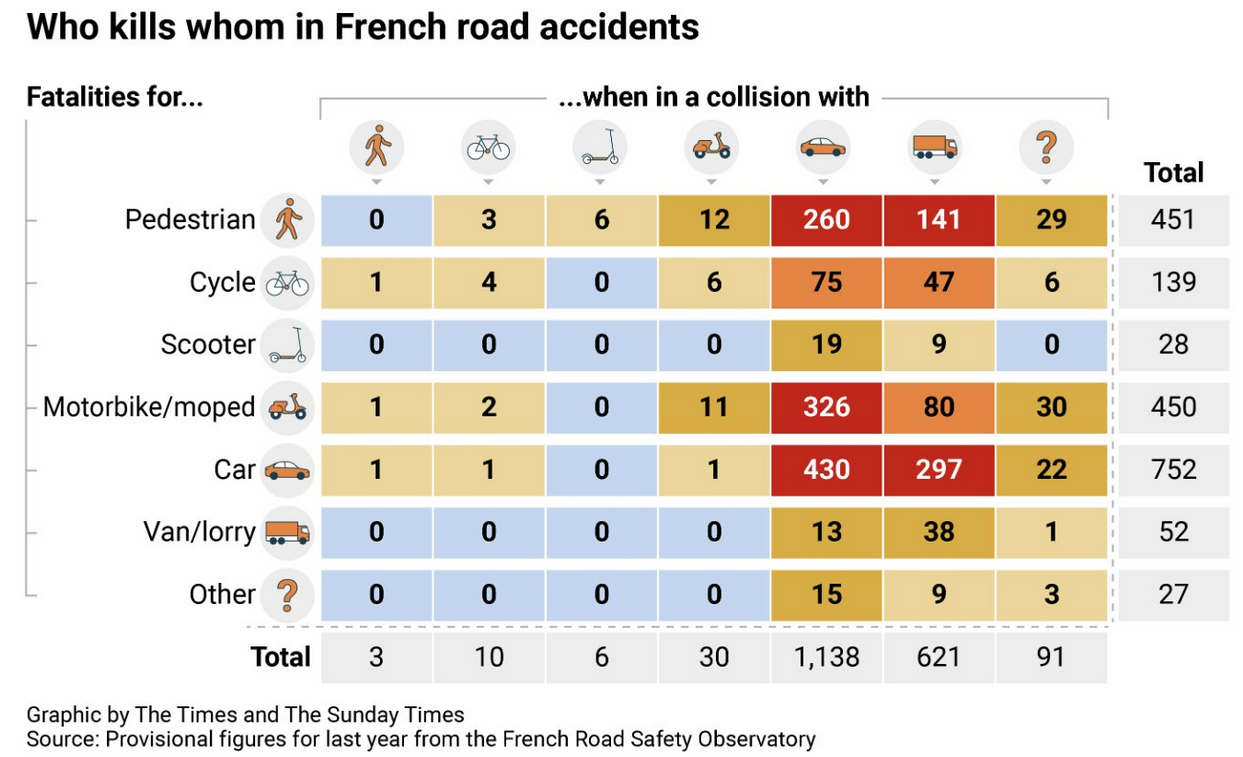 Looking at the chart like this with non-normalized data you might conclude that riding around on a scooter makes you near invincible compared to walking even if hit by a car.