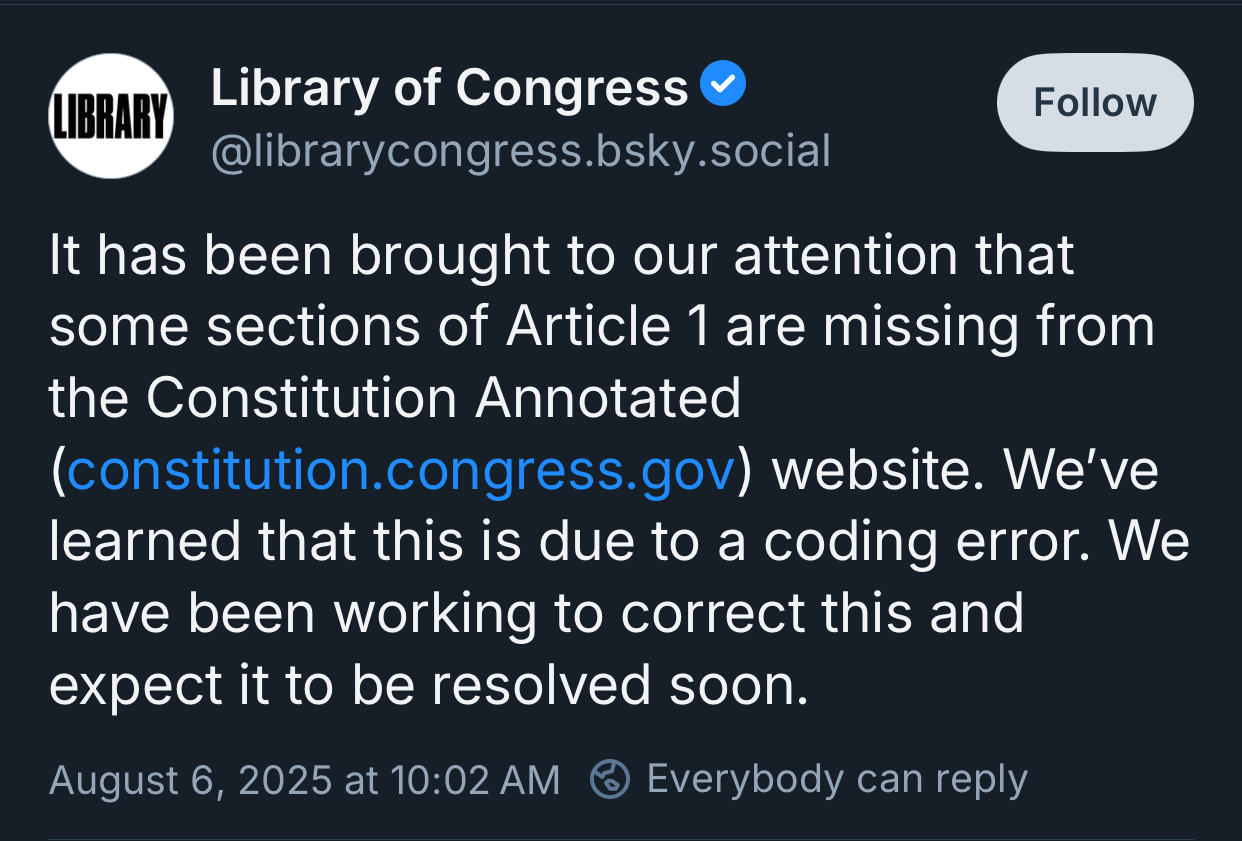 Playing devil’s advocate here: most websites are generated by programs, so it’s possible it could be a coding error. That said, for it to plausibly be a coding error in whatever generator they’re using, they’d have to store the Constitution with each paragraph in a separate file. That’s the only way I could possibly see a “coding error” exclude the stuff that was excluded.