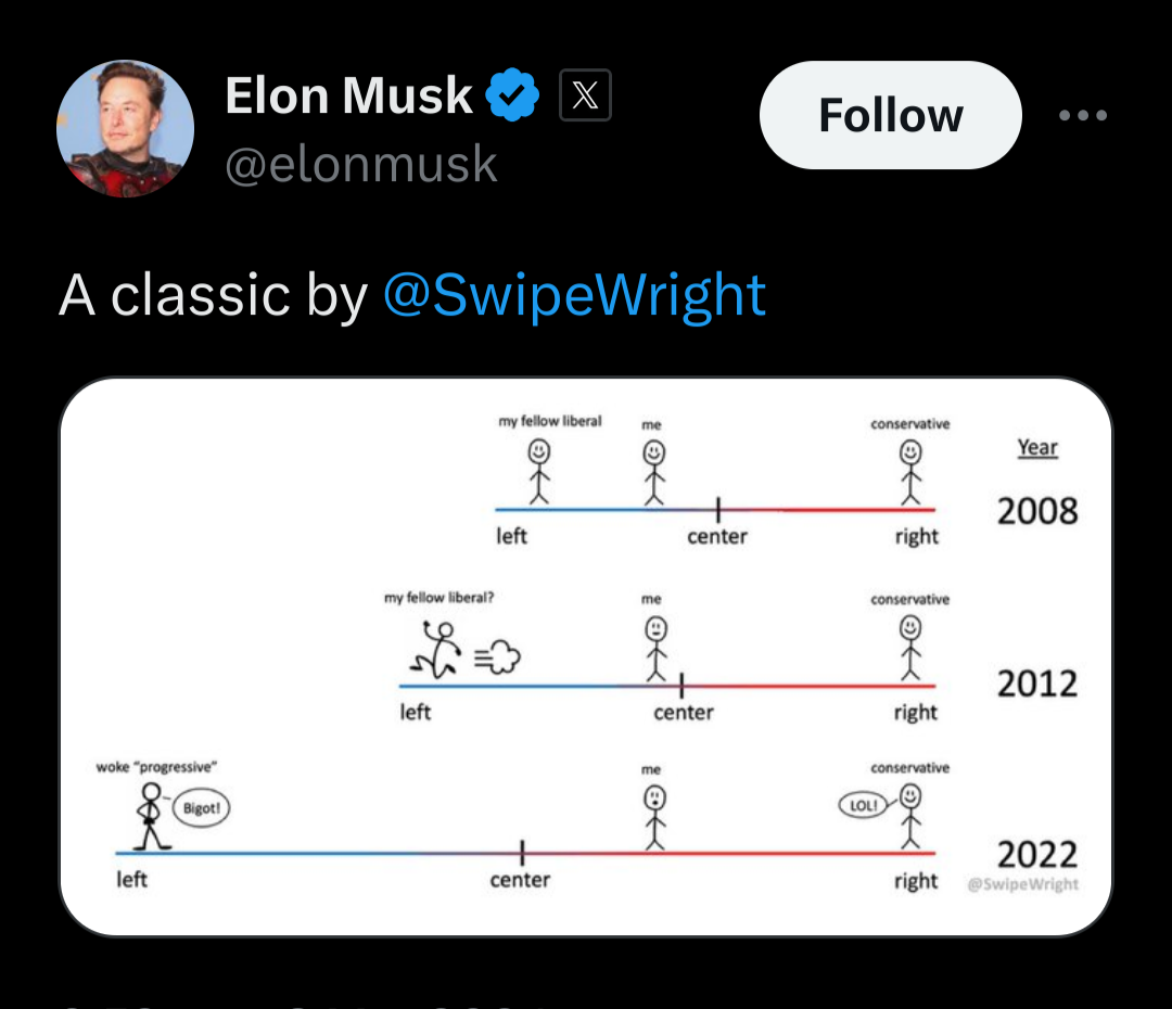 This is true though. 1992 Bill Clinton would be a republican today. Biden supported a 1994 crime bill that is considered racist today. Obama didn’t support gay marriage in 2008. Now liberals are fighting for sex change treatments for children. People 30 years ago would consider such an idea a grotesque absurdity.