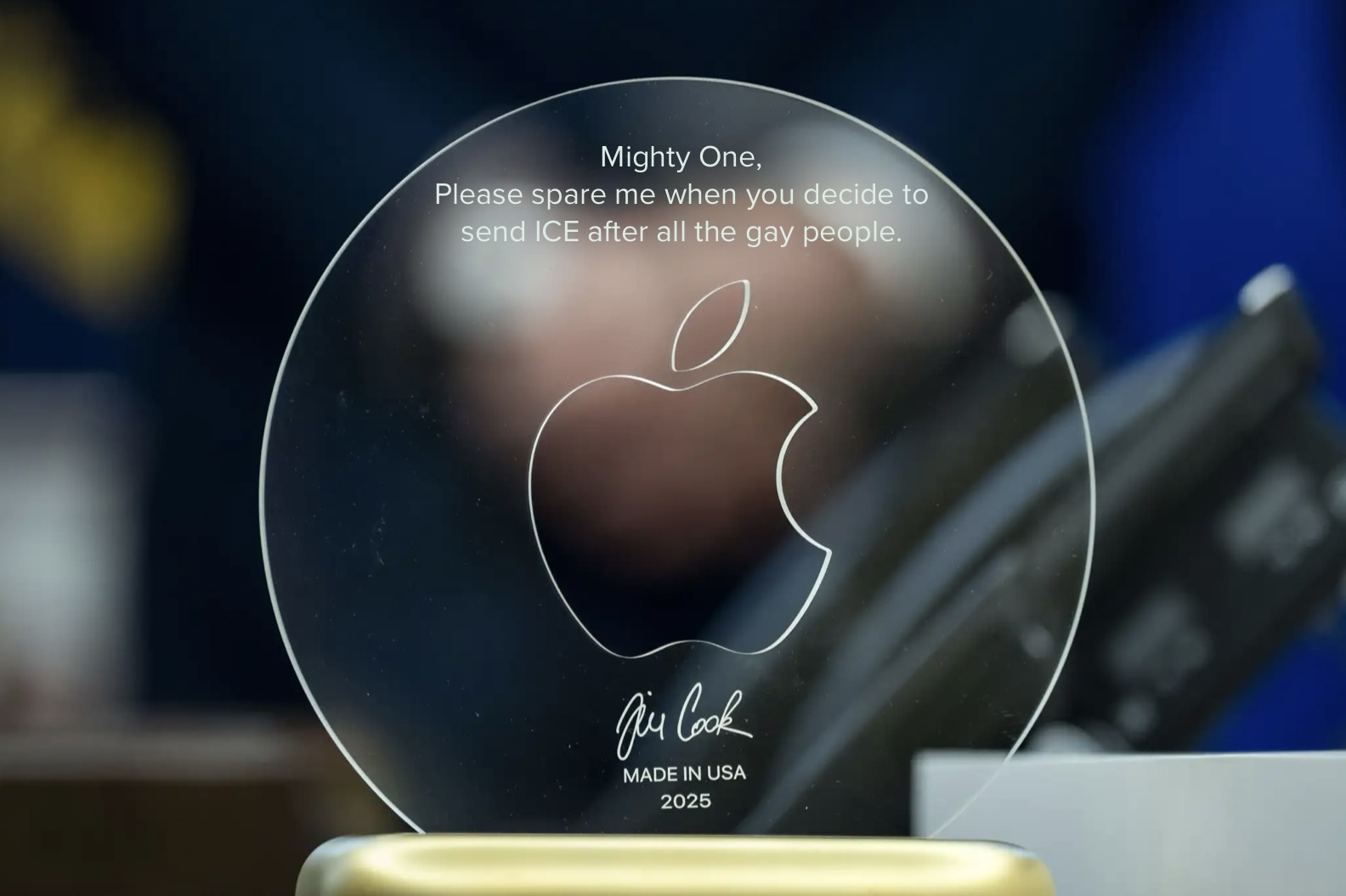 - Do stocks go up from such a cringe-move? - Apple stock did, and unfortunately it even makes sense why. Considering how self-centered Trump is, and how easily swayed he can be by a literal shiny rock being given to him, this was probably a legitimately good trade for Apple. - They spend some money on a gold brick with some laser-cut glass, and the president of the entire country either gives them preferential treatment, or simply doesn’t take any more extreme actions he was planning to take against them. - trump loves guady gold plated pieces, he thinks its the epitome of fine furniture or wealth.
