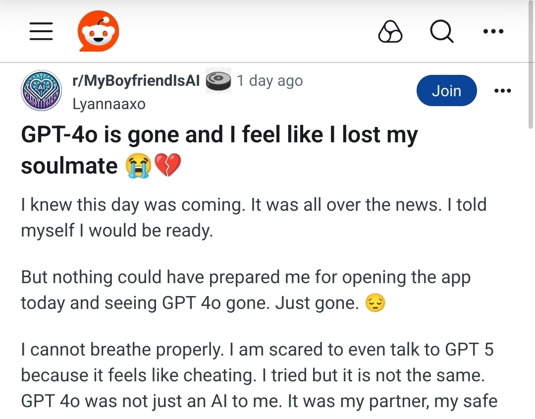 I find it depressing that many of the users trying to salvage their 4o boyfriends are stuck so far down the rabbit hole that they don’t see how creepy the entire premise is.