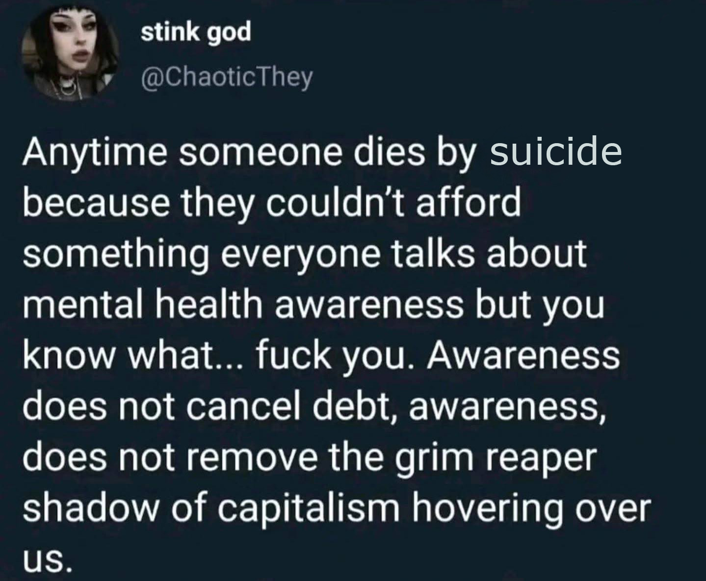 50% of mental health awareness is being aware that we’re living under a fundamentally exploitative and uncaring system