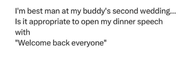 Only if both spouses were previously married, and you ask first. With the right crowd, that’s a howler.