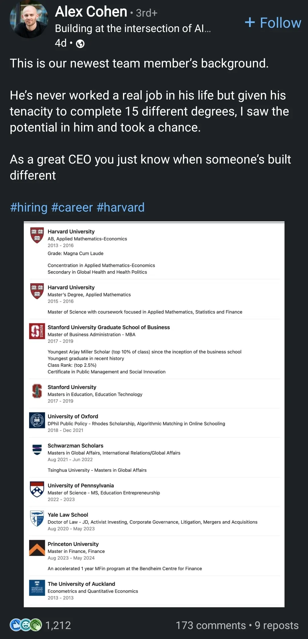 Drew@sopuli.xyzM to LinkedinLunatics@sh.itjust.works · 1 year agoLeave some degrees for the rest of usimagemessage-square3linkfedilinkarrow-up10arrow-down10