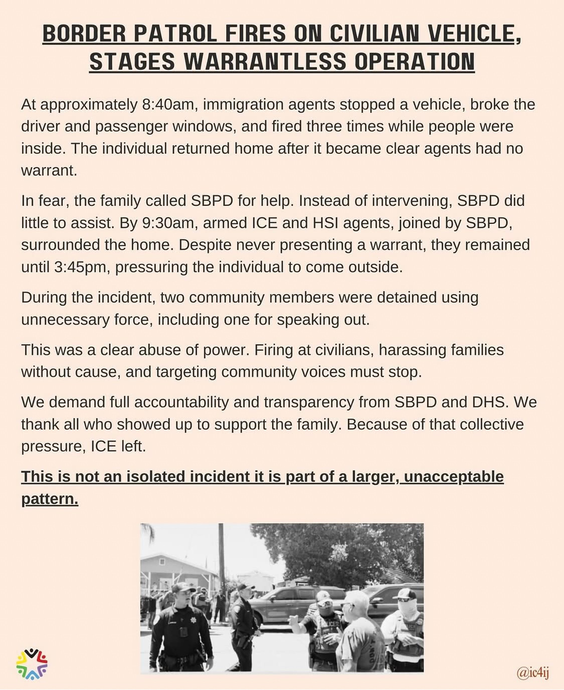 BORDER PATROL FIRES ON CIVILIAN VEHICLE, STAGES WARRANTLESS OPERATION At approximately 8:40am, immigration agents stopped a vehicle, broke the driver and passenger windows, and fired three times while people were inside. The individual returned home after it became clear agents had no warrant. In fear, the family called SBPD for help. Instead of intervening, SBPD did little to assist. By 9:30am, armed ICE and HSI agents, joined by SBPD, surrounded the home. Despite never presenting a warrant, they remained until 3:45pm, pressuring the individual to come outside. During the incident, two community members were detained using unnecessary force, including one for speaking out. This was a clear abuse of power. Firing at civilians, harassing families without cause, and targeting community voices must stop. We demand full accountability and transparency from SBPD and DHS. We thank all who showed up to support the family. Because of that collective pressure, ICE left. This is not an isolated incident it is part of a larger, unacceptable pattern.