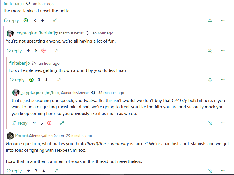at no point have I ever identified as a tankie. I mod the db0 Tankiejerk comm. I am also banned from Hexbear and ML.