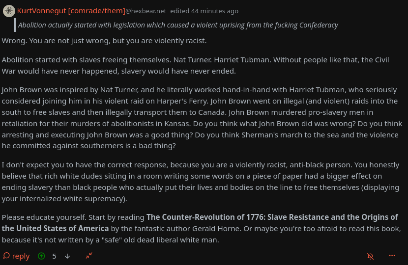 I don’t expect you to have the correct response, because you are a violently racist, anti-black person. You honestly believe that rich white dudes sitting in a room writing some words on a piece of paper had a bigger effect on ending slavery than black people who actually put their lives and bodies on the line to free themselves (displaying your internalized white supremacy).