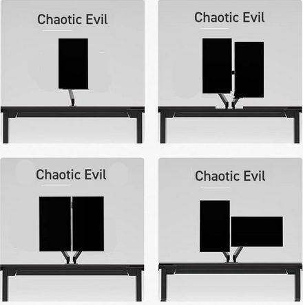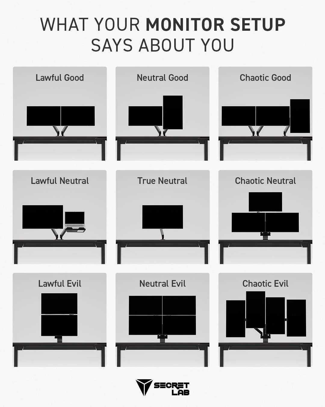 Lawful evil due to a lack of desk real estate. Though I do deeply desire a vertical monitor too.
