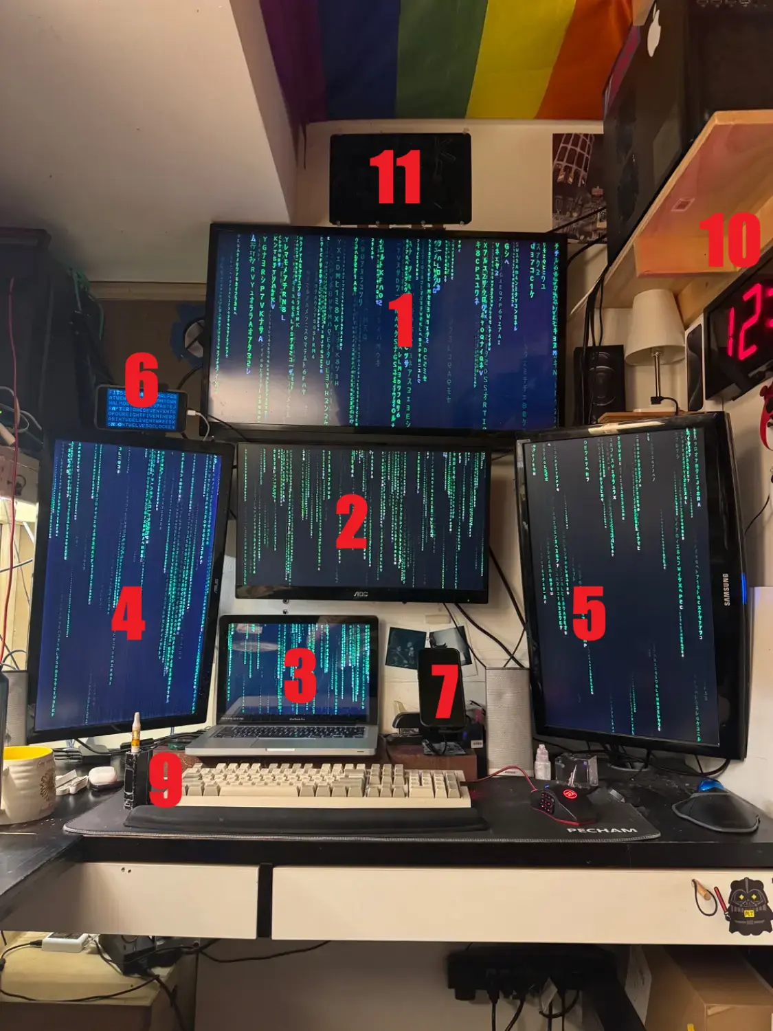 I only see 6-7? Can you point it out. Also goals lol! I only have 3 screens. No cool arms for monitors, so monitors on top of monitors. I’d love to have one stacked on top of my main monitor
