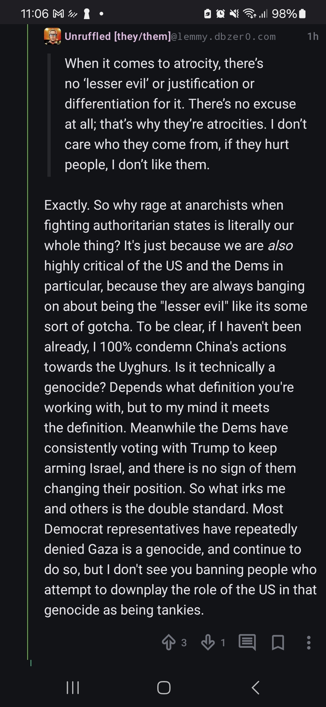 …yeah. I blocked that whole instance a week or two ago. c/Piracy just isn’t worth it. Also, never liked that Unruffled person all that much, and I really don’t like them after this "“It’s only genocide if I can blame the US - otherwise it’s just ‘Sparkling Crimes Against Humanity’” 🙄