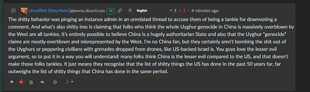 Playing apologist for tankies is not really all that much better than being one. Saying that simping for red fascist regimes as the ‘lesser evil’ doesn’t make one a tankie, as Unruffled said, denying the Uyghur genocide, and leaving Holodomor denialism up in a comm where other genocide denialism is removed is all very much tankie apologism.