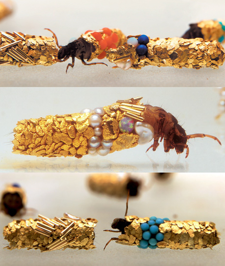 Caddisfly larvae live in streams and other fresh water sources, housing themselves in tubes they have created from items in their natural environment. Using sand, pieces of shell, etc., the caddisfly, a close relative of the butterfly, uses silk to connect and upholster their protective tubes. A naturalist at heart, Mr. Duprat experimented with the larvae, placing them in a home aqaurium with pieces of gold, gold rods, semi-precious, and precious stones. They immediately went to work, creating this: