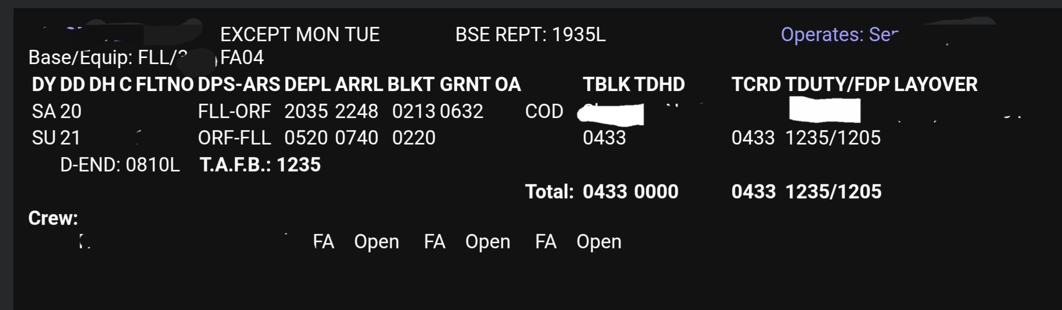 Take the example of this fun little overnight trip, you fly one leg to Norfolk, sit on the ground for five hours (six and a half, but half hour deplaning, one hour boarding) then fly back. Your flight time (paid time) is 4hrs33 and your time away from base (time on duty) is 12hrs35