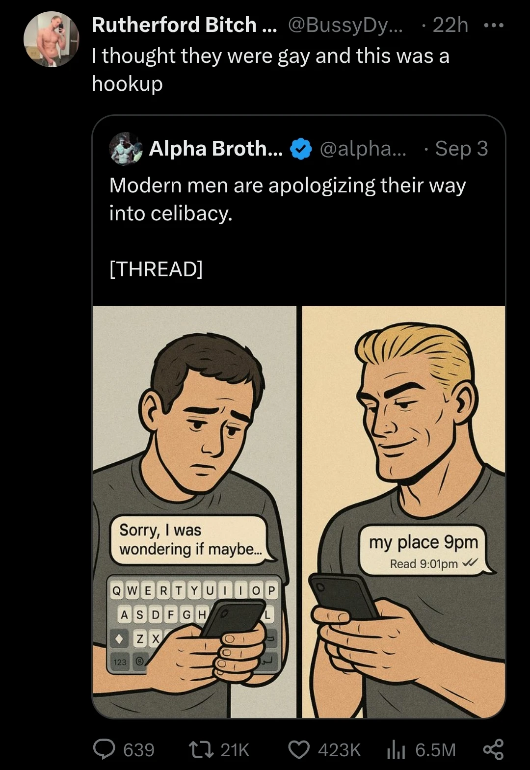 I said “likely”, as I realize that’s not always the case, but in my experience social anxiety is more likely to manifest in “I totally understand if not” than starting out with an apology in this context. That’s just my experience, but starting with an apology is often “nice guy” behavior, which makes sense because a lot of the “alpha” accounts are actually appealing to “nice guys” and not just guys who are nice that happen to have social anxiety.