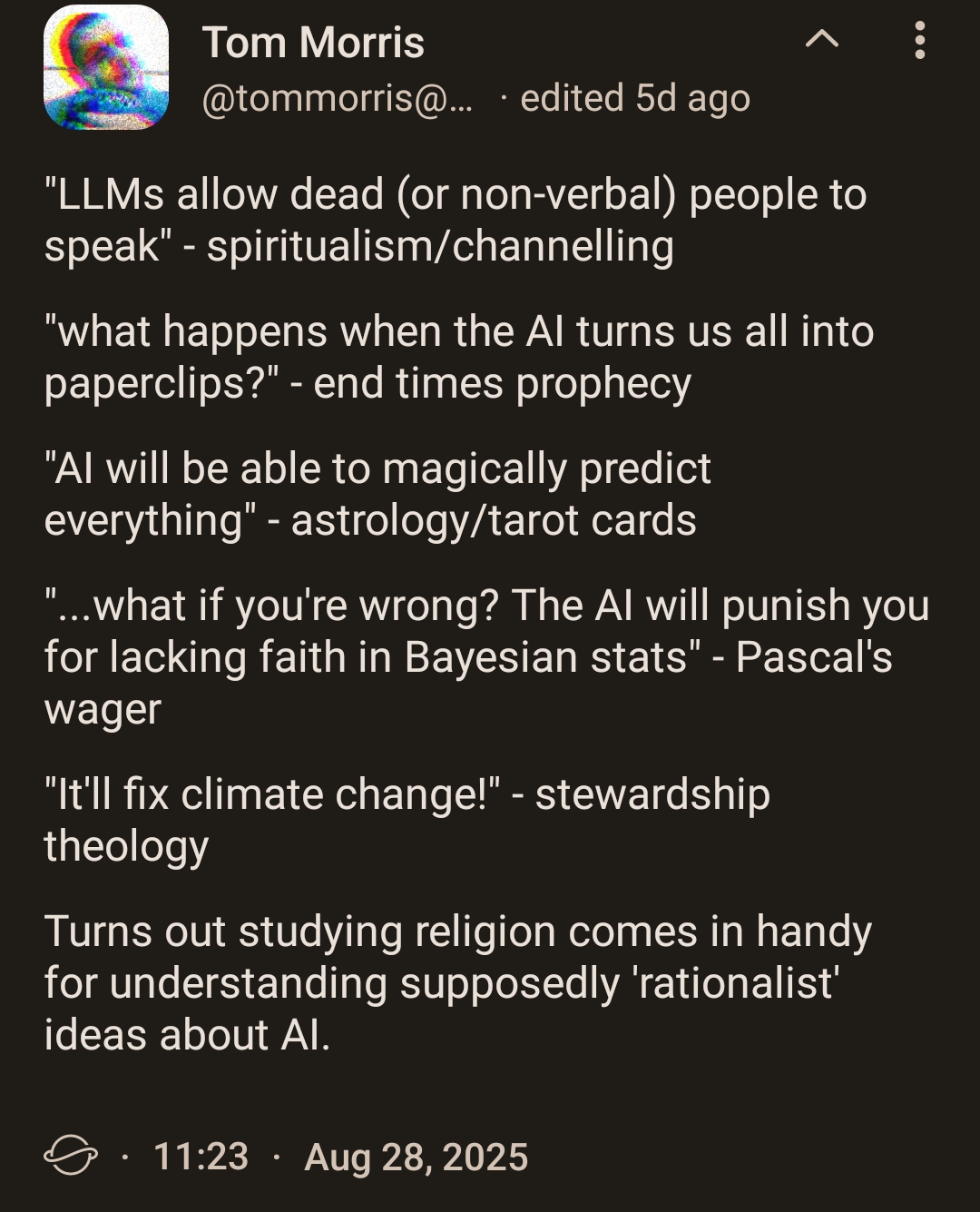 But anyway, there already are many individuals and small groups promoting some kind of idea of an LLM based spiritual thought structure, its not really that hard to just use an LLM as a tarot or horoscope reader, or invent your own kind of AI-mancy, a particular ritualistic /way/ of interacting with it, and /interpreting/ it.