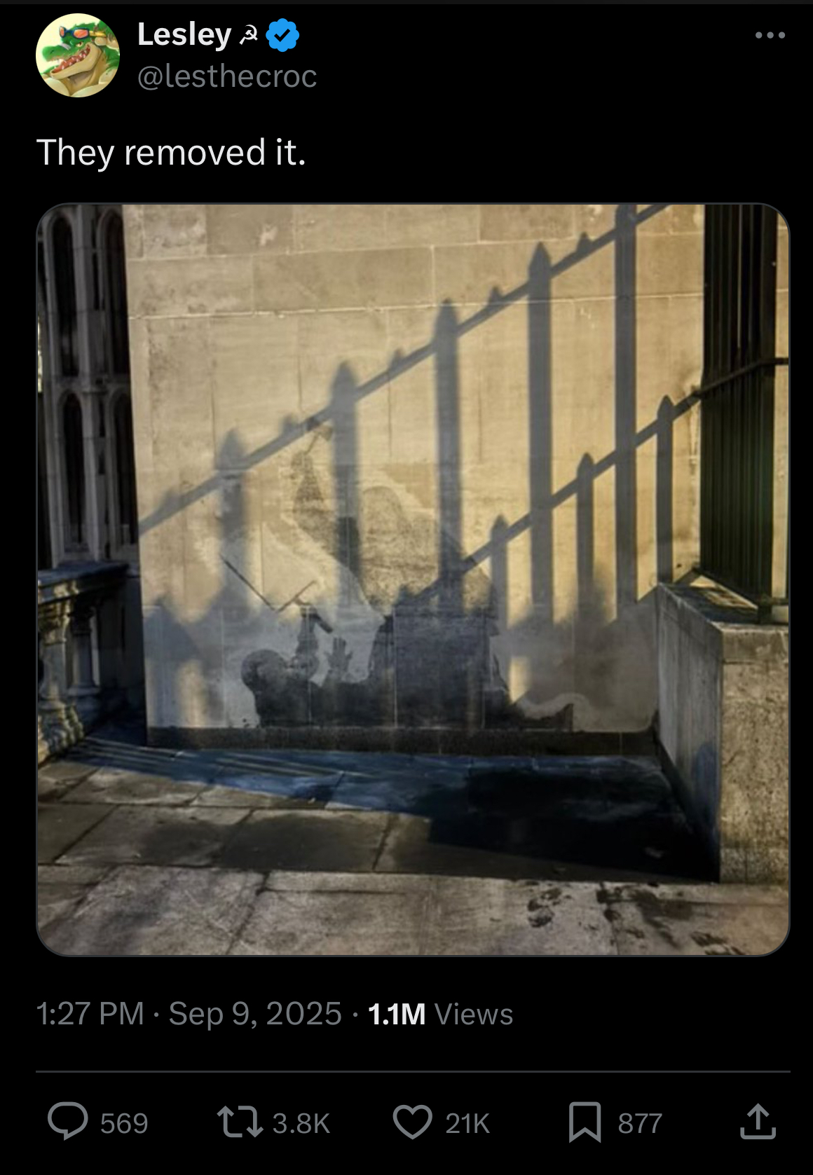 It’s on the ministry of Justice building, which and this is true is worth a lot more than the painting, even if it was not a sharply critical piece against the ministry of Justice. They absolutely are going to paint over it.