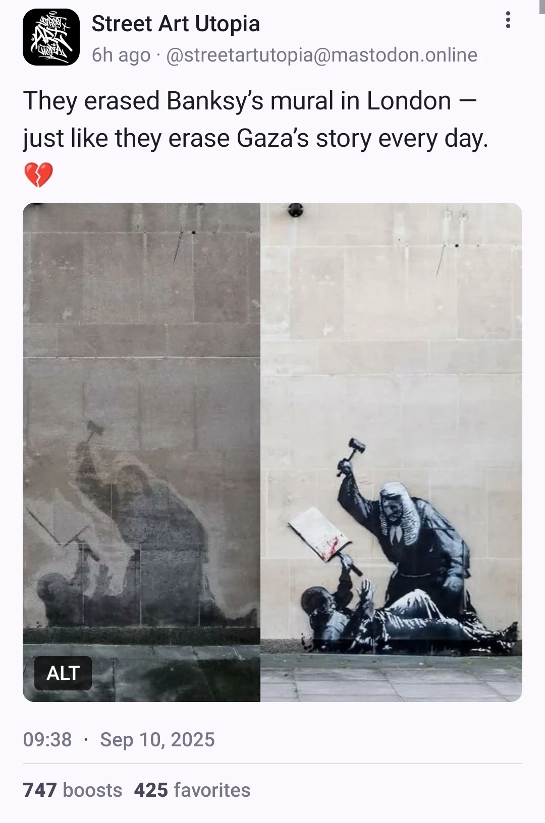minus-squareDeacon@lemmy.worldlinkfedilinkEnglisharrow-up57·2 months agoThe final form of the art piece. Honestly, I wouldn’t even be surprised if Banksy anticipated this. It wouldn’t be too tough to predict that the government would respond this way.
