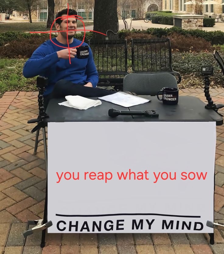 minus-squareAngryCommieKender@lemmy.worldlinkfedilinkEnglisharrow-up19·edit-222 days ago I’m aware the top one is Crowder. Kirk was literally standing under a “change my mind” “prove me wrong” banner when he was shot