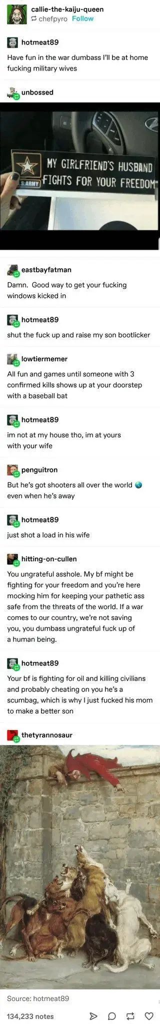 minus-squarecaptainlezbian@lemmy.worldlinkfedilinkEnglisharrow-up22·2 months agoOh there’s a whole community of people who taunt the troops with it. It’s especially popular during unpopular wars. So yeah you go get stationed to LA or Chicago, don’t worry buddy, we’ll keep your bed warm.