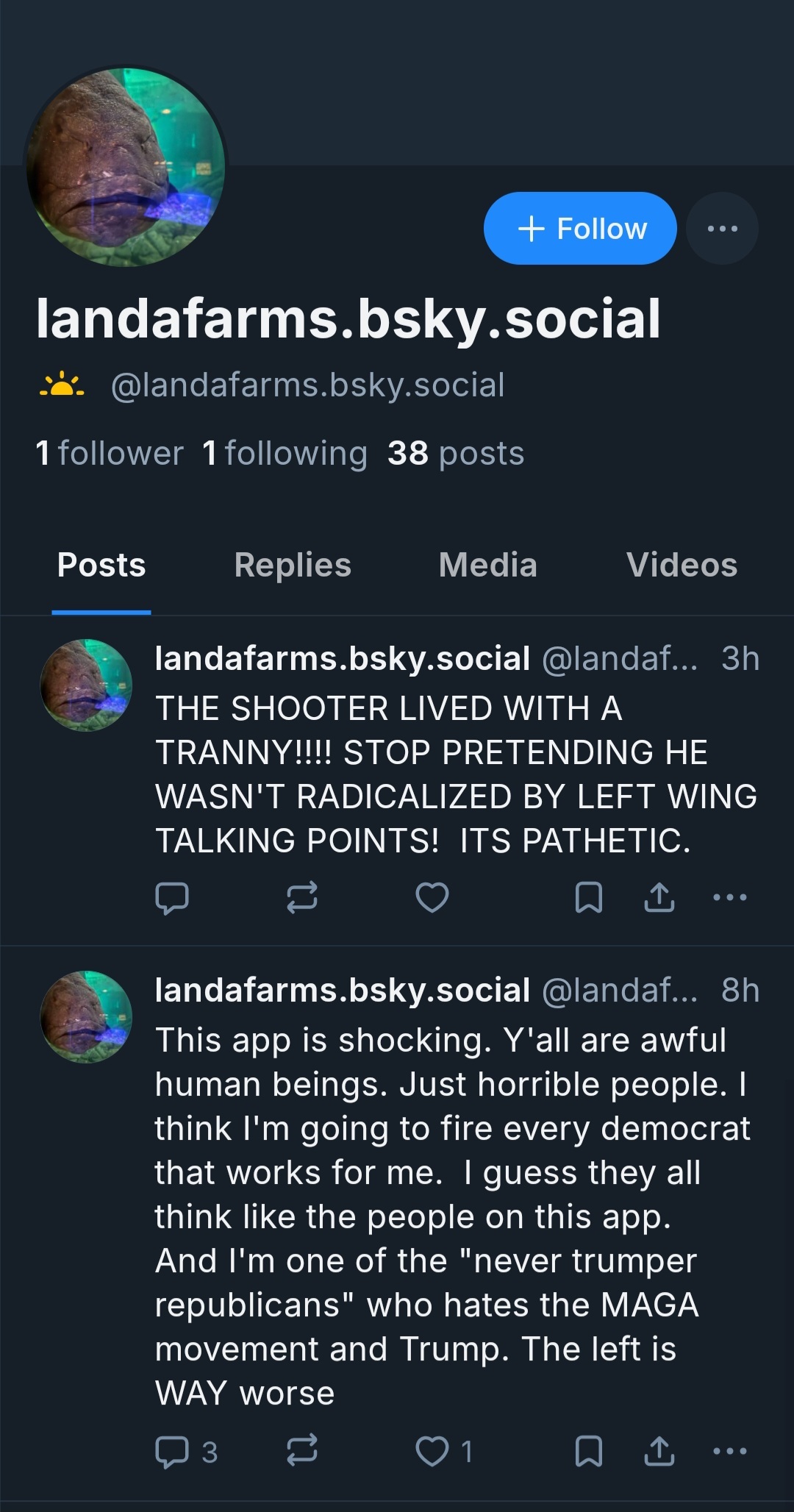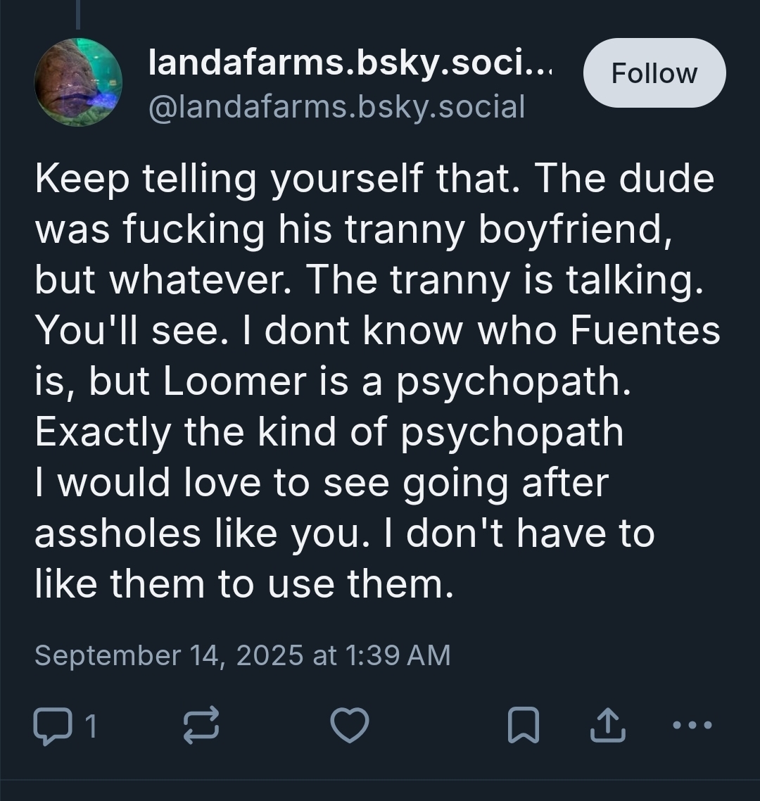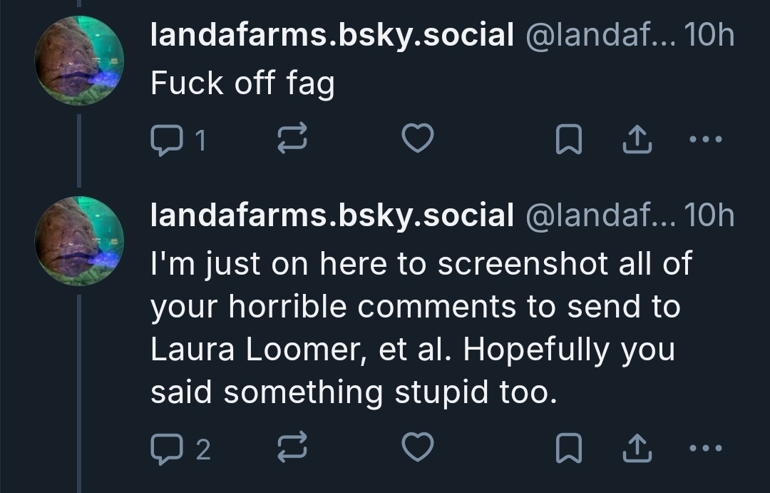 Meanwhile, this guy openly admitted to joining Bluesky explicitly to screenshot people and report them to Laura Loomer, and was throwing out slurs in the comments to provoke them, but it took at least three reports and over 24 hours for the moderation team to do anything about it.