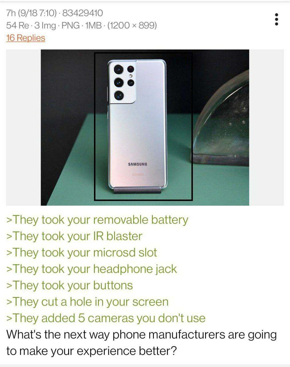 Oh Christ. You’ve just triggered a premonition in me–the Galaxy S32 Ultra will be the first smartphone with no physical buttons or ports. You can turn it “off,” but that will only turn on a sort of extreme power saving mode. It will still ping your location once every few minutes, and will keep the fingerprint scanner active. You will “turn on” the device by holding your finger on the fingerprint scanner for four seconds. They will advertise the “quick startup” as a new feature. Volume will be controlled by sliding your finger along the right edge of the phone, which the screen will wrap around all the way to the back. It will be impossible to hold the phone without touching some part of the screen.