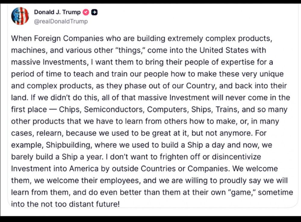 So he wants to get other countries to bring their business here but also wants the foreign experts to piss off after teaching the US citizens how to do their jobs. He also, in the same post, tells them how the US will then beat them at their own game after they need to be taught how to play because they couldn’t figure it out on their own.