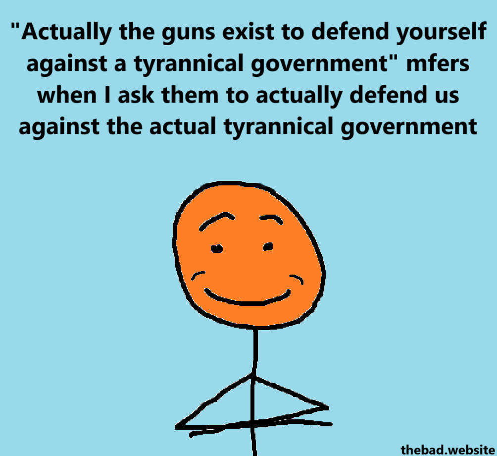 “Actually the guns exist to defend yourself against a tyrannical government” mfers when I ask them to actually defend us against the actual tyrannical government