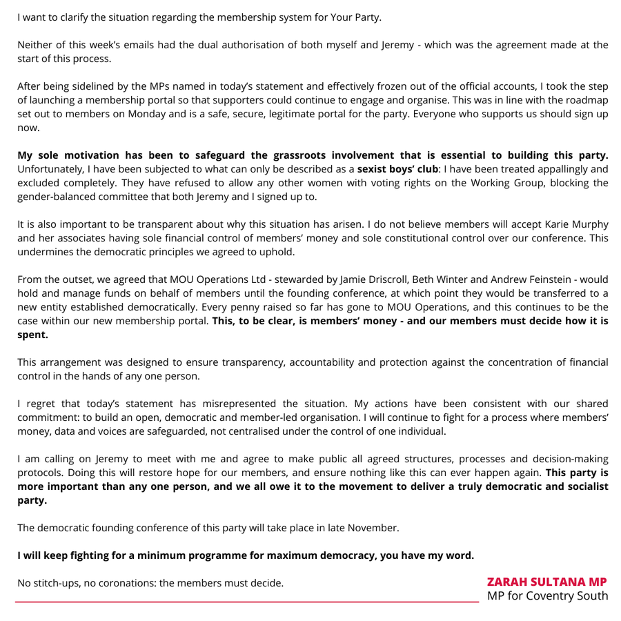 Zarah issued a counterstatement calling the party leadership a “sexist boys club”: