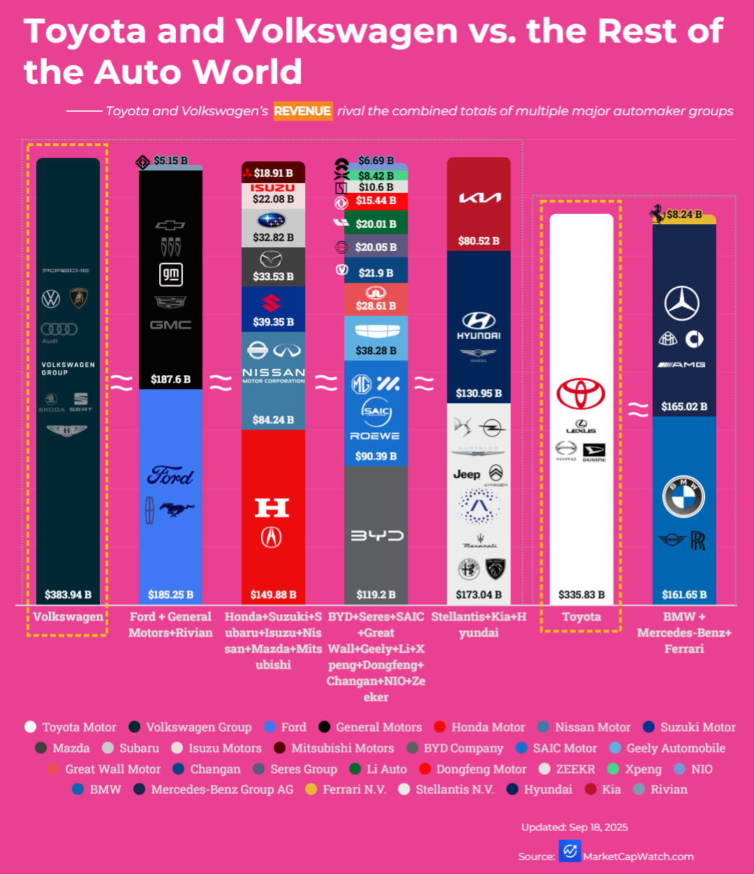 This chart breaks down the revenues for the world’s largest carmakers, grouping brands under their parent companies. The standout insight: Toyota and Volkswagen each generate annual sales on par with the combined totals of several other major automaker groups. Toyota’s revenue rivals the sum of BMW + Mercedes‑Benz, while Volkswagen’s is close to Ford + GM combined. Source: MarketCapWatch