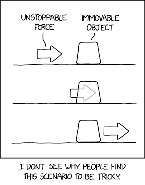 [An arrow pointing to the right and a trapezoid are labeled as ‘Unstoppable Force’ and ‘Immovable Object’ respectively.]