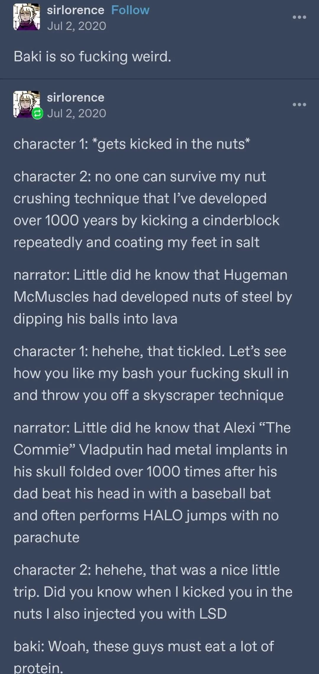 You know you’ve reached the peak of strength when you force your dad to eat your imaginary dinner. This is referencing a real Baki scene.