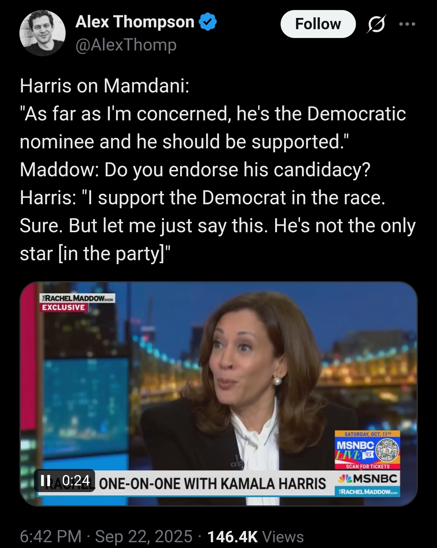 It (Harris) is technically backing mamdani in the least backing least him way possible, while holding her nose and making her disapproval of him very obvious. The bare minimum for making it so that technically one democrat I’ve heard of–other than DINO’s like sanders– has backed him so we can’t truthfully make the sweeping dramatic statement that "no major democrat has endorsed zohran mamdani.