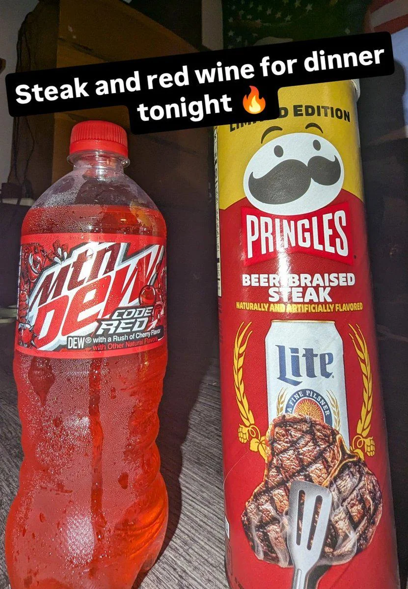 At my local supermarket, a Code Red is $3, a Can of Pringles is $2.50, and just a glance at the prices of different cuts of beef, it seems like you’d pay at least $13 for a pound of steak. Things like Rice and beans would probably be around the same price as the processed food or cheaper, but probably not anything that includes meat.