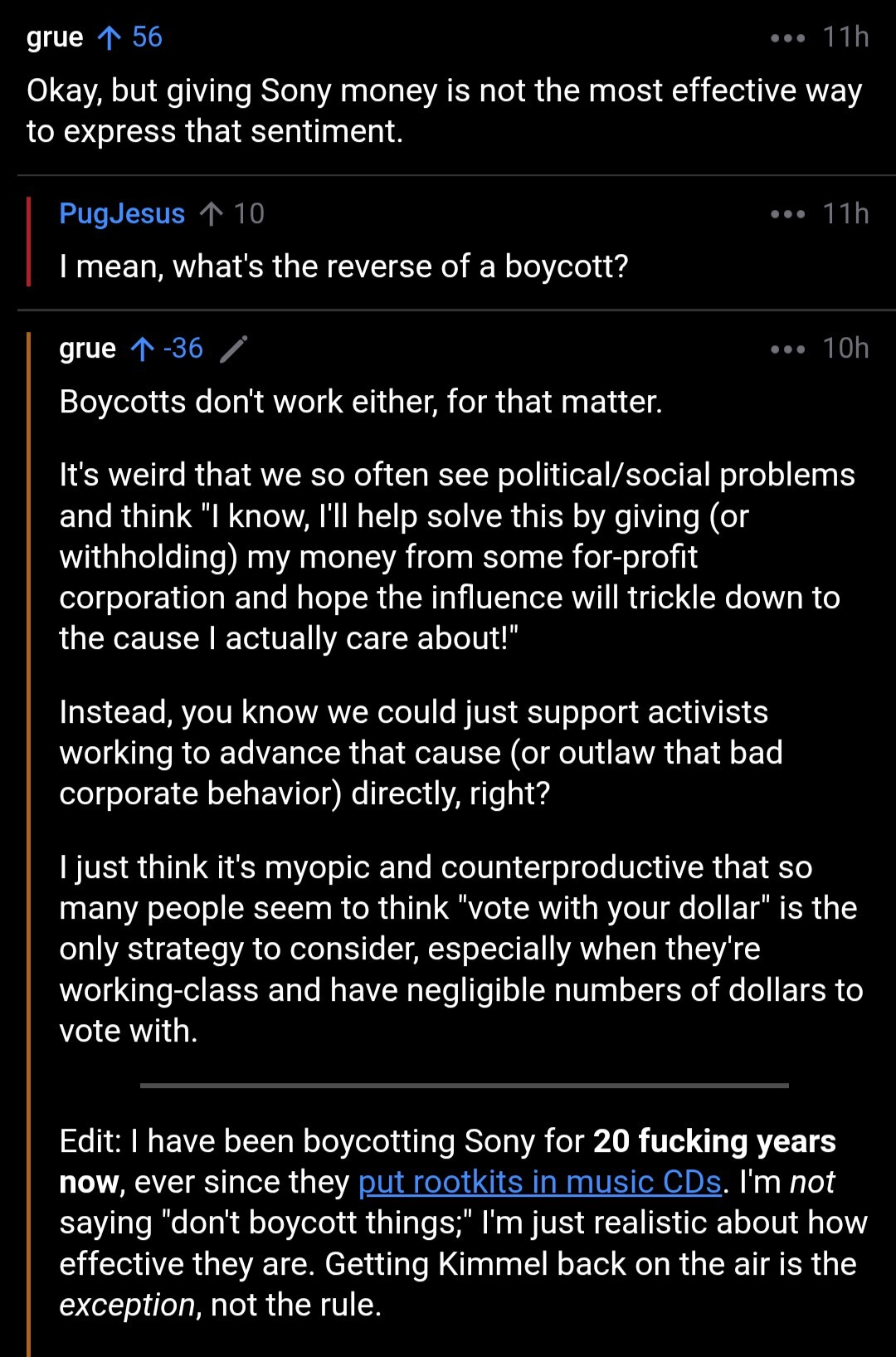 Edit: I have been boycotting Sony for 20 fucking years now, ever since they put rootkits in music CDs. I’m not saying “don’t boycott things;” I’m just realistic about how effective they are. Getting Kimmel back on the air is the exception, not the rule.